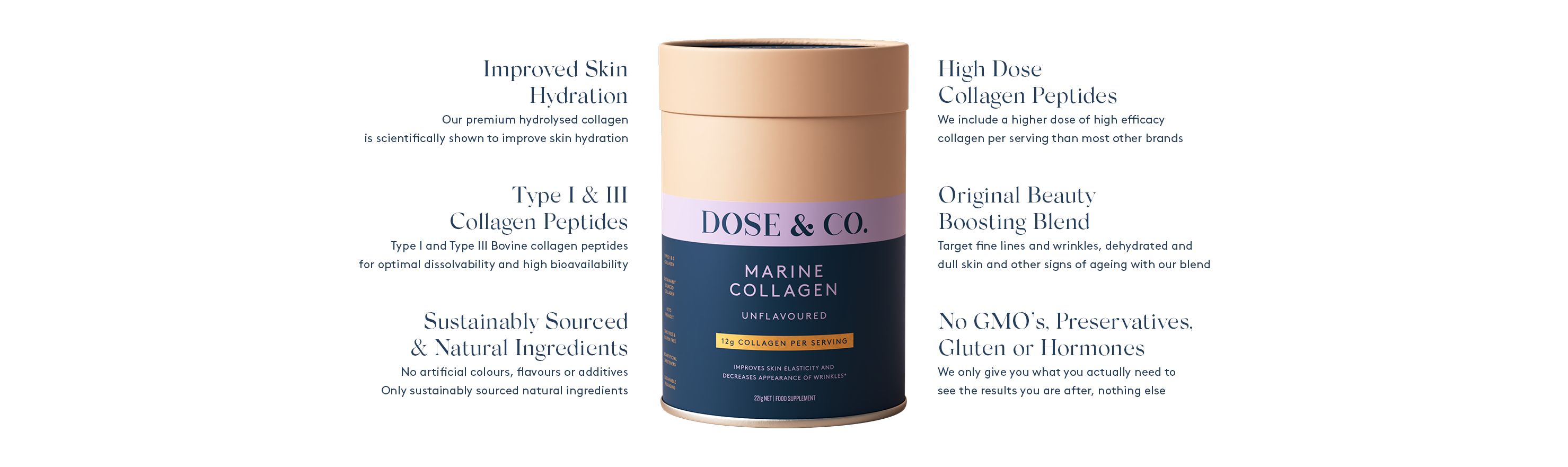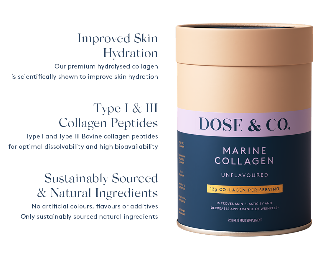The collagen found in Dose & Co helps support the structural integrity of the skin's layers, leading to optimised skin tone and texture. Collagen’s ability to improve skin elasticity also helps give skin a more even appearance.