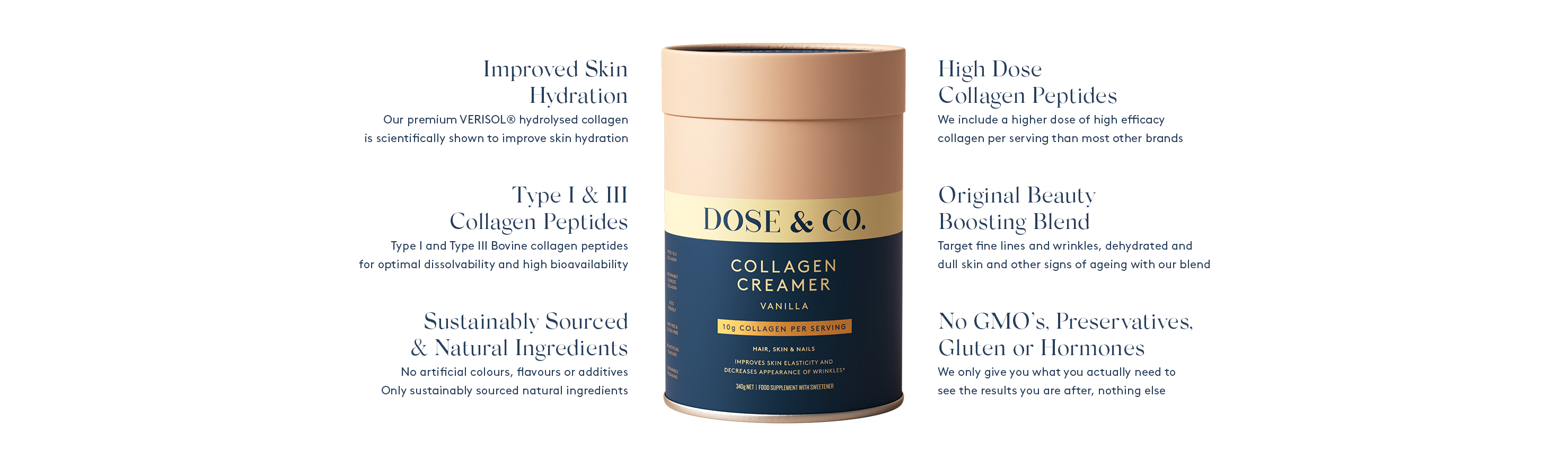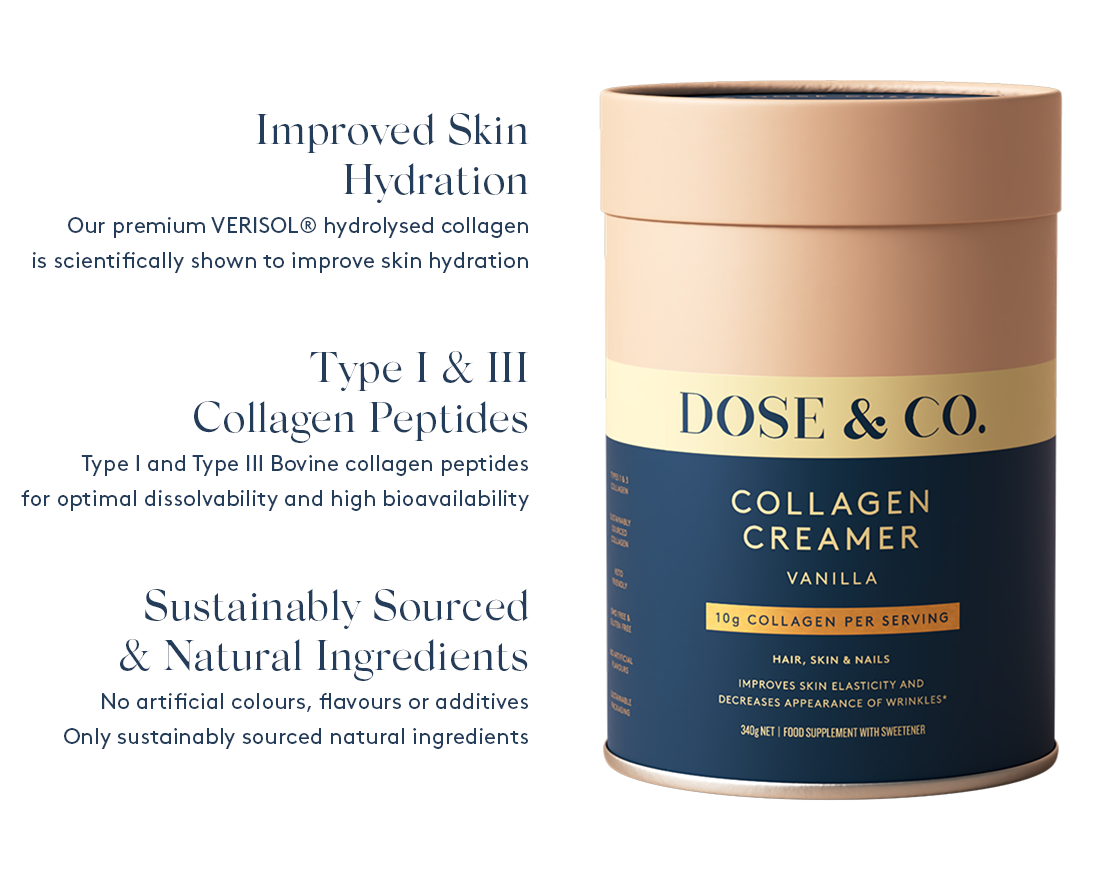The collagen found in Dose & Co helps support the structural integrity of the skin's layers, leading to optimised skin tone and texture. Collagen’s ability to improve skin elasticity also helps give skin a more even appearance.